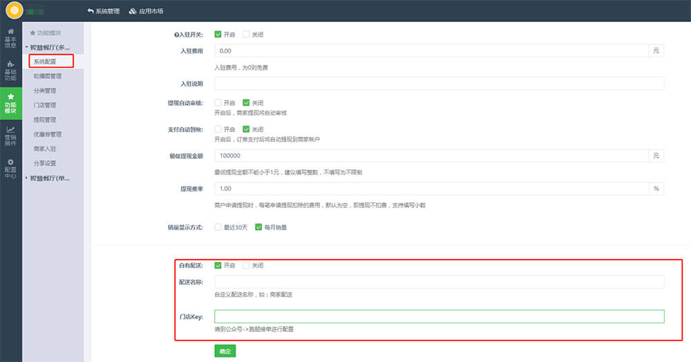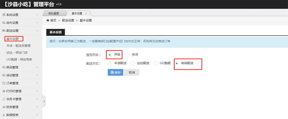 1、进入餐厅管理后台,选择已设置的配送方式名称并开启保存后完成配置流程