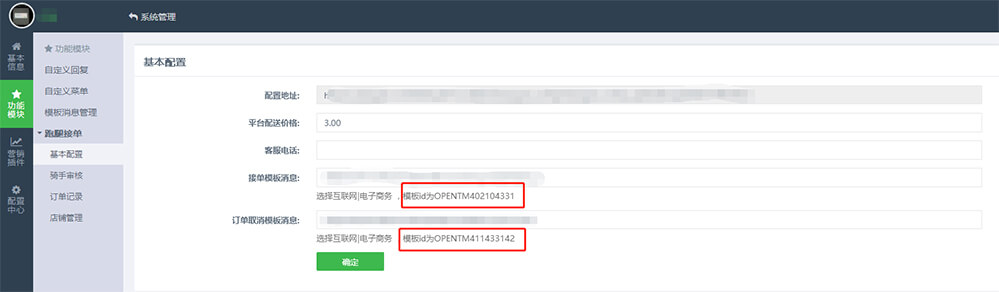 1、配置地址为系统自动生成,平台配送价格与平台客服电话需配置(注:平台配送价格为跑腿平台收取使用跑腿平台方的价格,即每一个外卖订单跑腿平台收取的跑腿费)