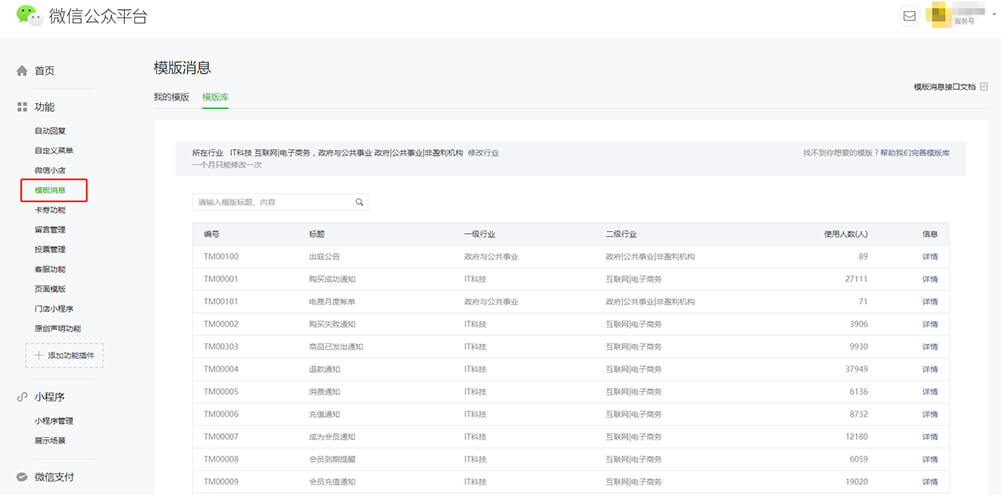 2、百度公众平台服务号后台选择对应的模板消息添加使用,并复制模板id到后台配置