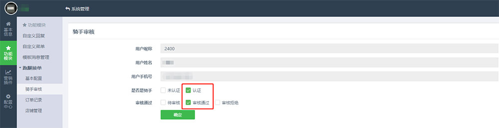 2、点击骑手管理选择设置已通过认证申请的骑手(注:店铺Key为系统自动生成)